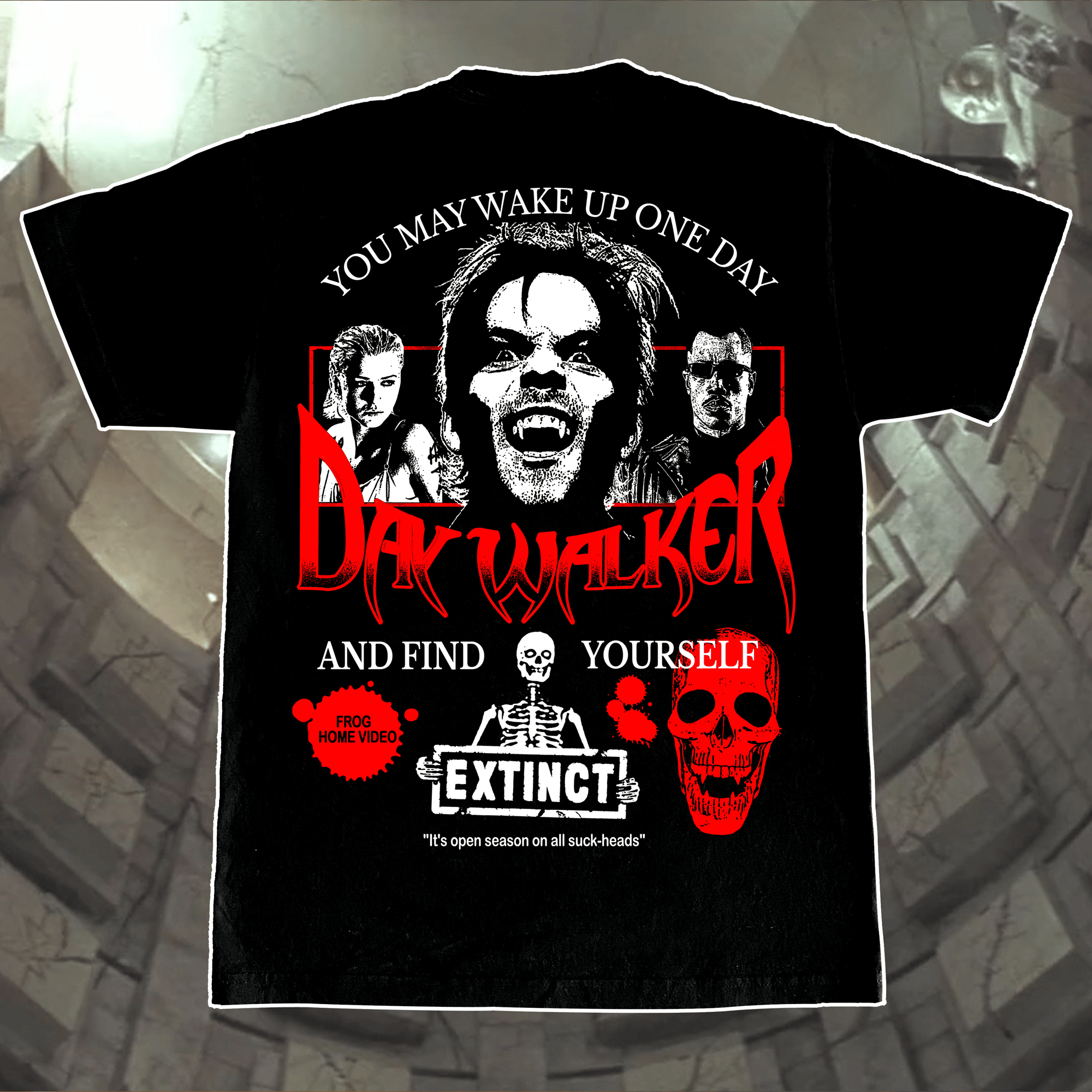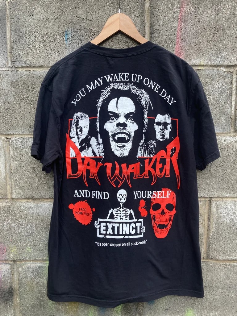 Front and back printed with white and red on 100% cotton 6.1oz Comfort Colors Heavyweight T-shirts. Custom Frog Home Video Tag....